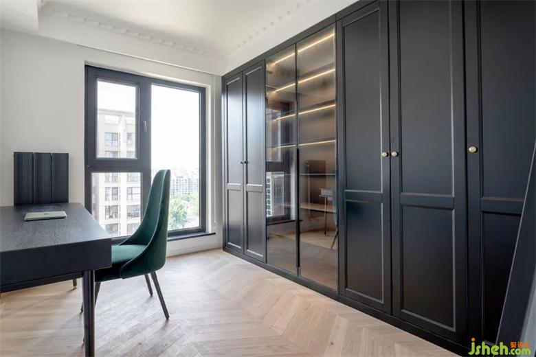 深顏色的儲物柜與裝修玻璃柜門結(jié)合,裝修打破整面黑色帶來的沉悶感,大尺寸的工作臺滿足日常的辦公需求。