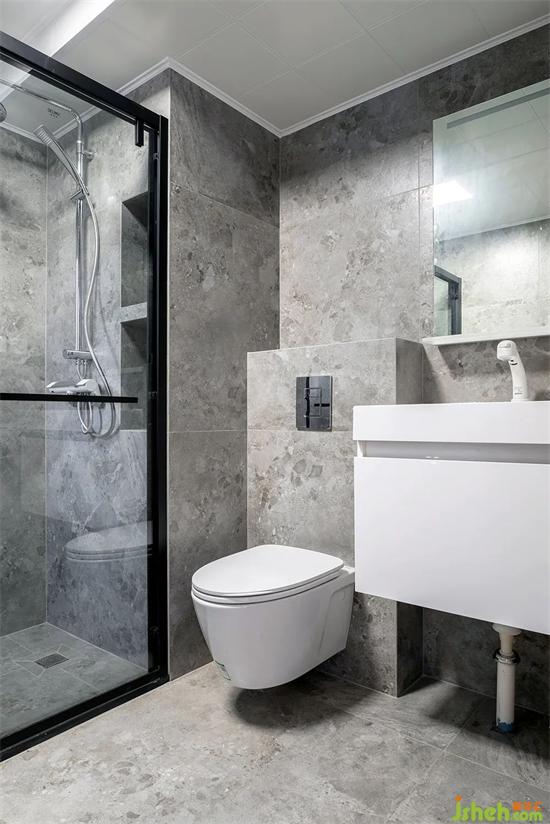 衛(wèi)生間增加了淋浴房,選用了好清理衛(wèi)生的壁掛馬桶。裝修通鋪深灰色的磁磚,空間既整體又耐臟。