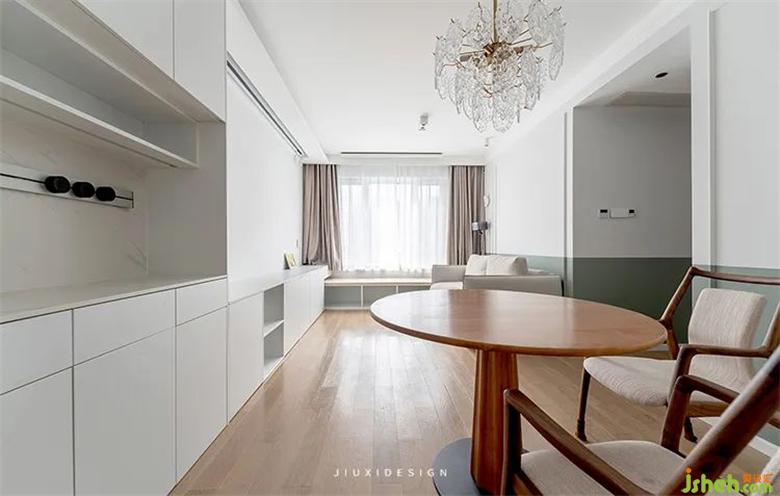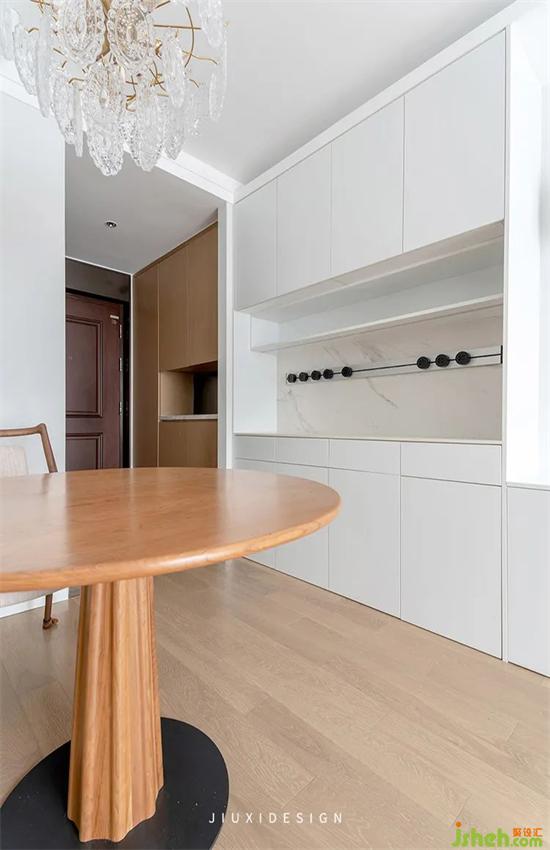 在旁邊設(shè)立了餐邊柜,補(bǔ)足廚房的功能,也豐富客餐廳之間裝修設(shè)計(jì)的聯(lián)系。