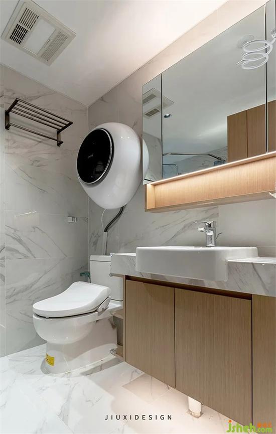 衛(wèi)生間的格局并沒(méi)有變動(dòng),為了更好的使用,增加了智能馬桶蓋及壁掛洗衣機(jī)。給拖把,毛巾,澡盆收納等規(guī)劃了相應(yīng)的位置。