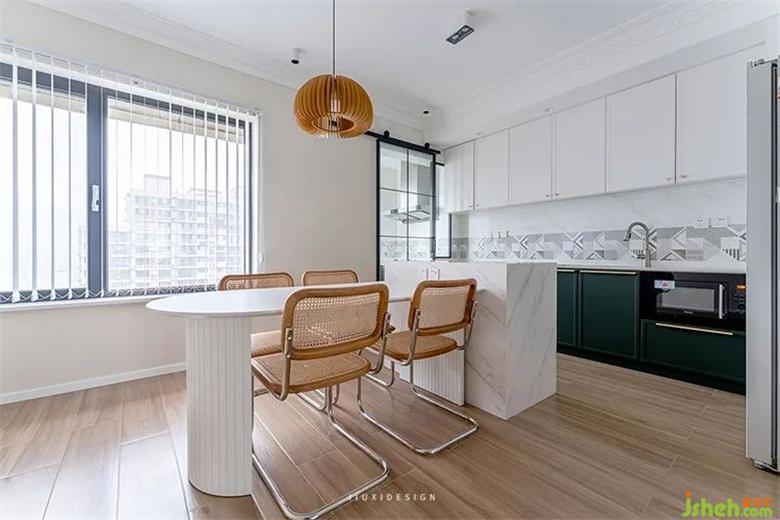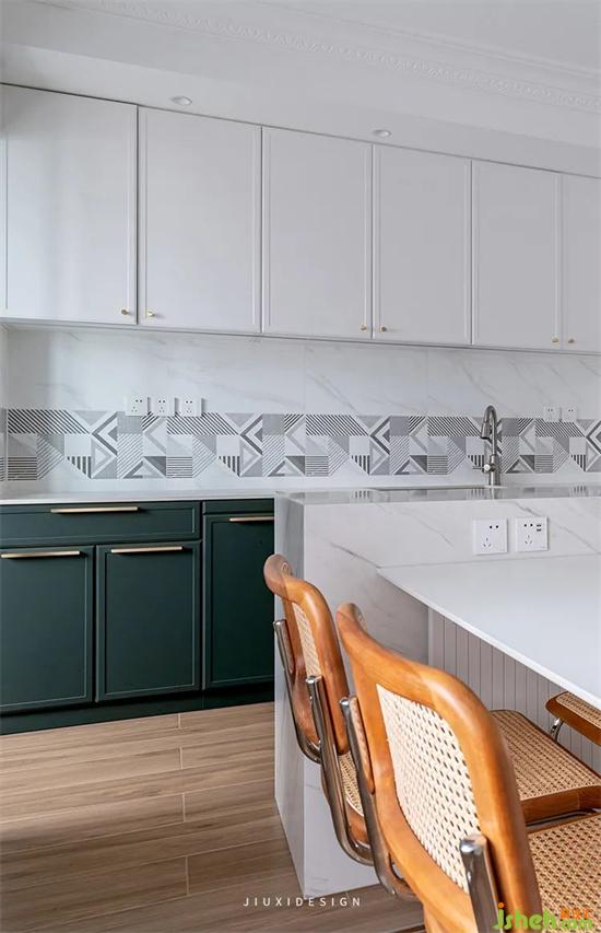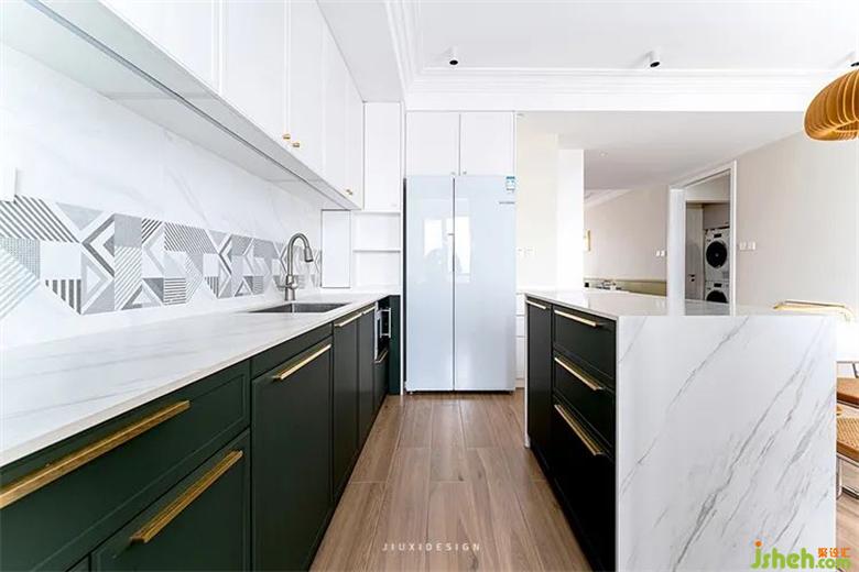 廚房高柜與地柜相結(jié)合,內(nèi)嵌一臺不小的冰箱。不僅削減了大電器的突兀感,還提升了收納空間。讓零碎物品,室內(nèi)設(shè)計師通通可以收進(jìn)柜子里,保持廚房的整潔干凈。櫥柜采用白色吊柜與復(fù)古綠地柜的潮流搭配,柜子上細(xì)窄線條與整個空間相呼應(yīng),增加層次感。配上金色的拉手,給予空間簡潔輕奢的質(zhì)感。