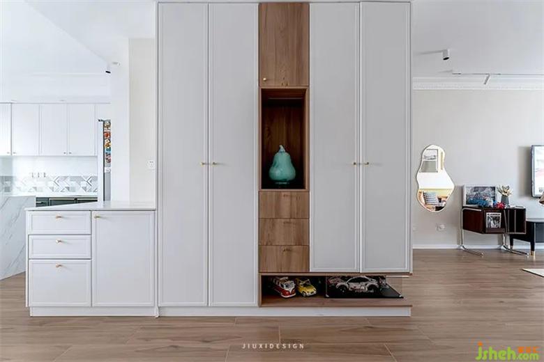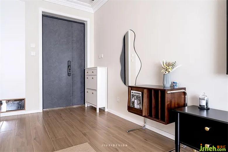 入門處設(shè)置了簡易的鞋柜,室內(nèi)設(shè)計師搭配藝術(shù)感十足的曲線鏡子,既能滿足簡單收納需求,也讓空間豐富多變。