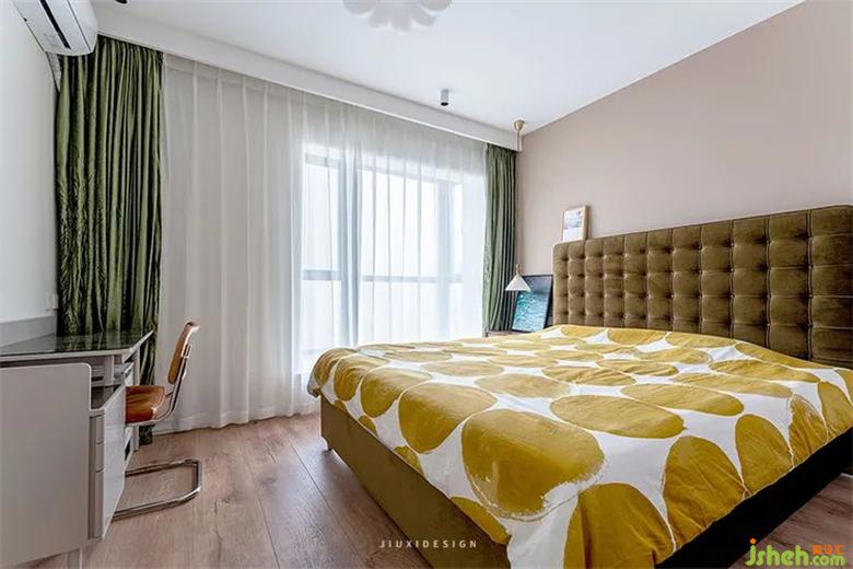 次臥強調(diào)安靜自在的舒緩感,大面積使用杏子灰,室內(nèi)設(shè)計師搭配自然氣息的復(fù)古綠窗簾。原木結(jié)合布藝的床頭混合設(shè)計,舒緩整個空間,并帶有一絲生機與從容感。