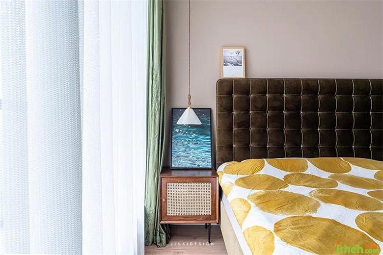 主臥布萊肯棕背景搭配墨綠色窗簾,低調(diào)又不失柔美。再配以飄逸的紗簾,給予人溫暖安謐的視覺感受。番茄家的黎草色方格拉扣款布藝床,與圓形暖色床品相搭配,室內(nèi)設(shè)計師打造舒適溫馨的氛圍。