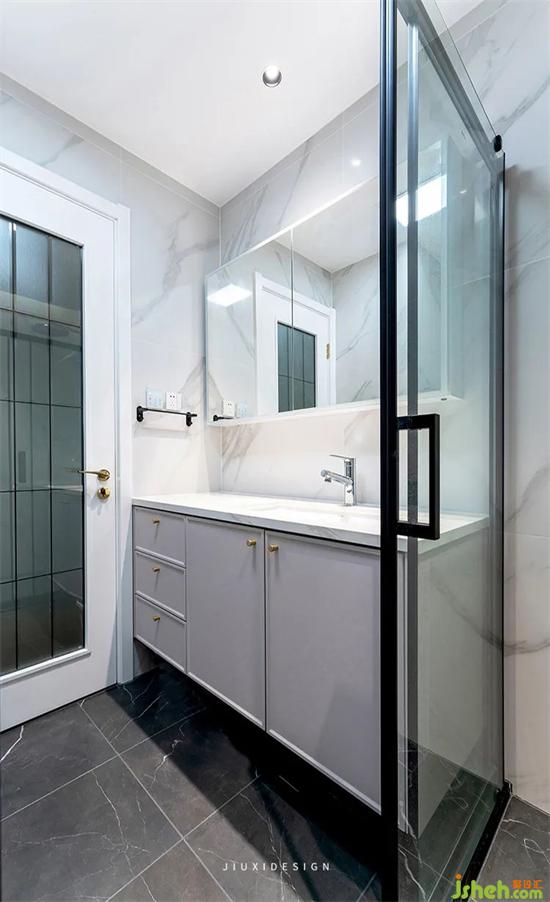 沉穩(wěn)的深灰色石材地磚,搭配清爽的白色墻面,室內(nèi)設(shè)計(jì)師拉開(kāi)空間的層次,清爽而有力量。略帶復(fù)古的淺灰色浴室柜,既是明度的階梯,也是呼應(yīng)復(fù)古氣質(zhì)的點(diǎn)睛之筆,讓整個(gè)空間清爽中更加溫柔。浴室柜的吊柜的形式,不僅方便清潔,還讓空室內(nèi)設(shè)計(jì)師間顯得輕盈。下面暗藏了起夜燈,方便夜晚使用。大面的鏡柜擁有不可小覷的收納實(shí)力,在側(cè)墻設(shè)置了毛巾?xiàng)U,減輕臺(tái)上負(fù)擔(dān)。