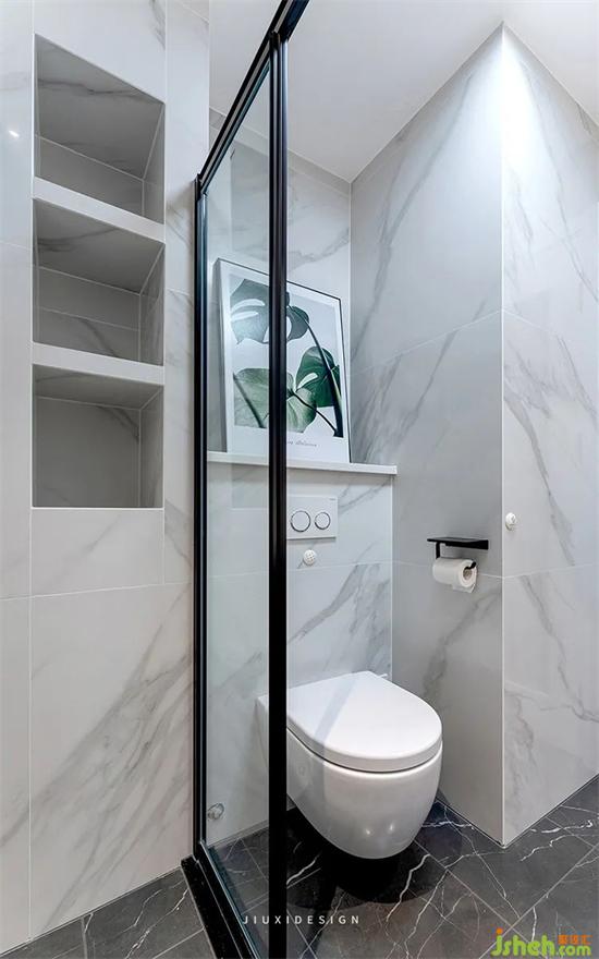 獨(dú)立的淋浴房墻面內(nèi)凹了三個(gè)壁龕,滿足大量收納的,整潔耐用,清理非常方便。馬桶選用的是壁掛馬桶,沒(méi)有任何死角,方便清潔衛(wèi)生。次衛(wèi)采用高級(jí)灰的配色,整體的水泥質(zhì)感,塑造干練而整潔的基底。浴室柜原木色,室內(nèi)設(shè)計(jì)師給空間以自然的溫暖質(zhì)感。在功能上,智能馬桶的水箱,上方的壁掛洗衣機(jī)的管線等,也都進(jìn)行了暗藏處理。