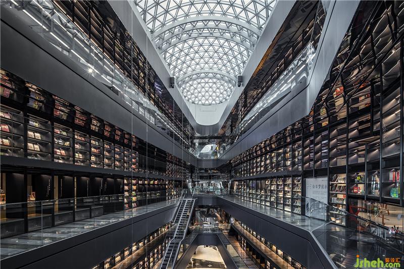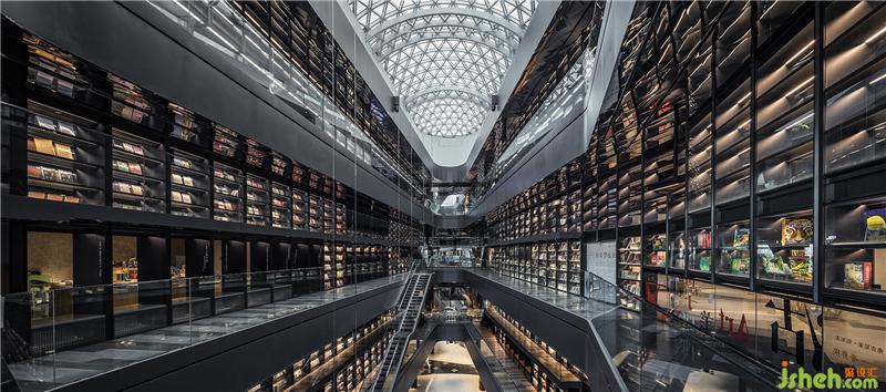 一樓到四樓,南面延伸至北面,在漫灑的天光映襯下,巨匯設(shè)計(jì)置入了兩道量體書(shū)墻,層高18米、全長(zhǎng)240米的尺度為全中國(guó)之最,使喧鬧的商業(yè)空間卻有著殿堂般儀式性的感動(dòng)與震撼。