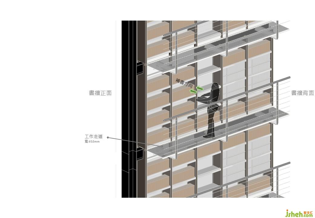 承載數(shù)十萬(wàn)冊(cè)圖書的書墻,以鋼結(jié)構(gòu)和透明玻璃為材質(zhì),除了視覺穿越,也讓光線自由漫射在挑空區(qū)域,與空間實(shí)體交迭出各種形式的語(yǔ)匯。閱讀者穿梭在書墻與挑空之間,成為這殿堂景象的一部分。