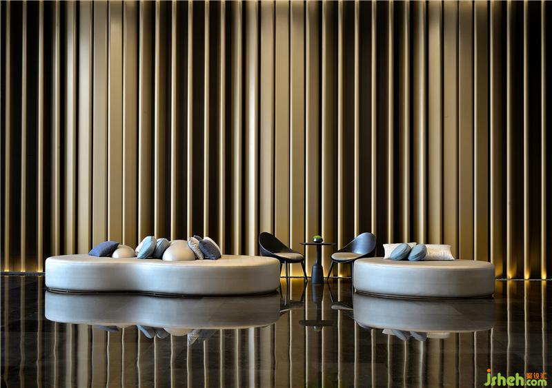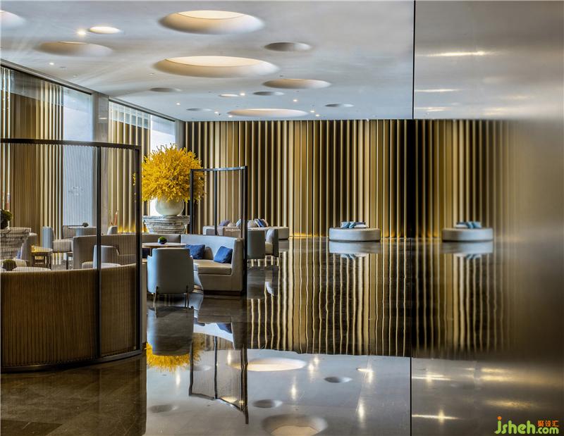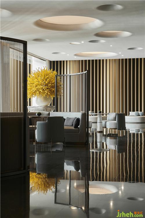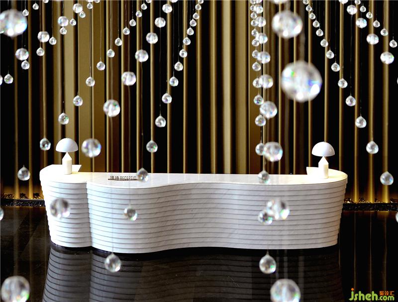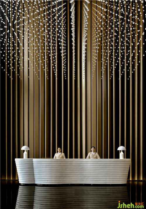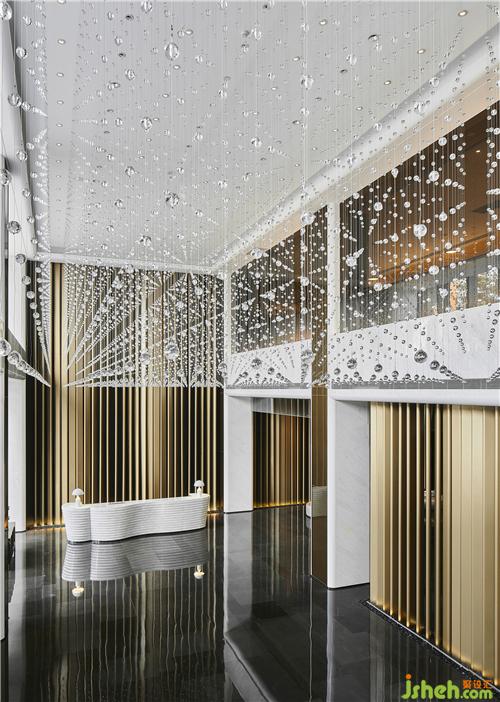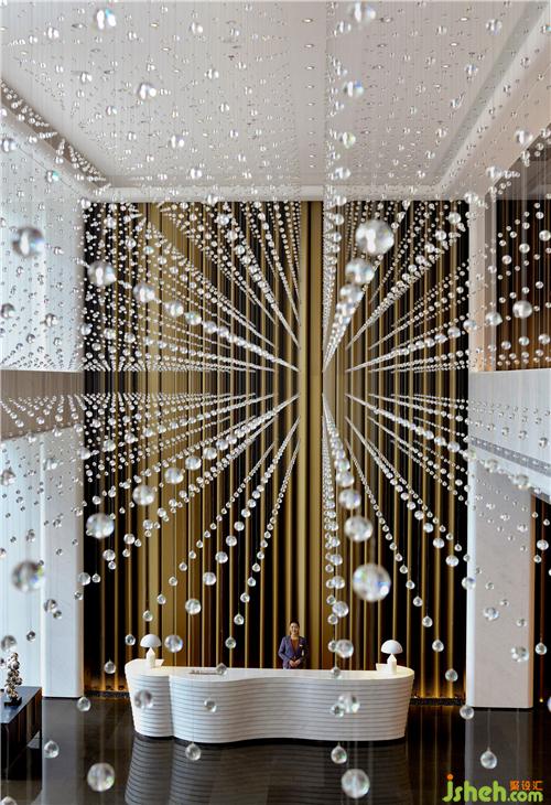 酒店大堂就像一篇優(yōu)秀文章的一個(gè)強(qiáng)有力的開(kāi)端,以熱情而優(yōu)雅的方式歡迎每位客人的到來(lái),并且開(kāi)門(mén)見(jiàn)山直入主題,將酒店的水主題向每位客人緩緩展開(kāi)。酒店設(shè)計(jì)象征著波瀾起伏水浪的墻面,水浪形狀的服務(wù)臺(tái),以水泡形式呈現(xiàn)的大堂吧天花,象征雨點(diǎn)的大堂水晶藝術(shù)吊燈、水滴形態(tài)的沙發(fā)、水漣漪的大堂吧家具、水岸邊的鵝卵石、倒影……把酒店的水主題意境演譯得生動(dòng)有趣、惟妙惟肖。酒店的空間路徑都預(yù)設(shè)對(duì)比及懸念,不同的點(diǎn)有不同的感受,整個(gè)路徑連起來(lái)就是一趟驚喜不斷的體驗(yàn)過(guò)程。入口處由小變大,由低變高,由暗變亮,先抑后揚(yáng),就如東晉陶淵明的《桃花源記》:林盡水源,便得一山,山有小口,仿佛若有光。便舍船,從口入。初極狹,才通人。復(fù)行數(shù)十步,豁然開(kāi)朗……