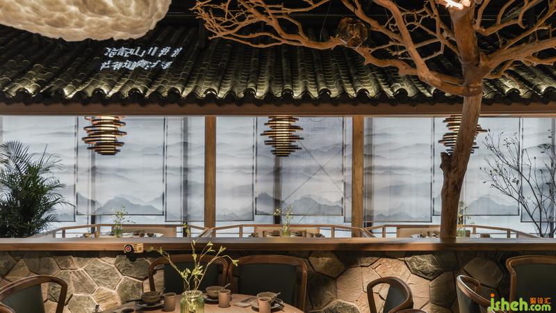 材料也基本選用中國傳統(tǒng)的木、石、小青瓦, 顏色則采用灰、白、木制本色,點綴了一抹青色。最初構(gòu)想整體用餐環(huán)境時,我們想讓顧客很遠(yuǎn)就看到看到小橋、流水、綠樹幽幽的門頭,走近一看,透過我們室內(nèi)設(shè)計師設(shè)定的半開敞視線,若隱若現(xiàn)看到內(nèi)部錯落的大小院子、老樹、白云等兒時熟悉的中國院子生活場景,這不僅僅是一場食憶之旅,更是一場身臨其境的感知。