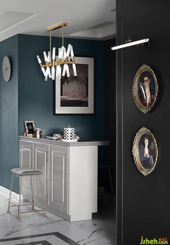 這是一套現(xiàn)代輕奢混搭的作品,濃郁但又不失生機的墨綠色,是一種獨特而又復(fù)古的色調(diào),恰到好處的介于復(fù)古和時尚之間,給整個屋子帶來一種時髦韻味。進到屋內(nèi),眼前是吧臺和過道,左手邊餐廳,右手邊客廳,視線很開闊,光線通透明亮。剛進門看到的灰色吧臺,這處原本是一面墻,看上去堵得慌,把墻拆掉后做了吧臺,讓我們的視線增加了延伸感。吧臺的設(shè)置為家里添加了一處休閑區(qū),可以在這里喝到回到家后的第一杯飲品,也是朋友間盡興夜談的一處佳境。