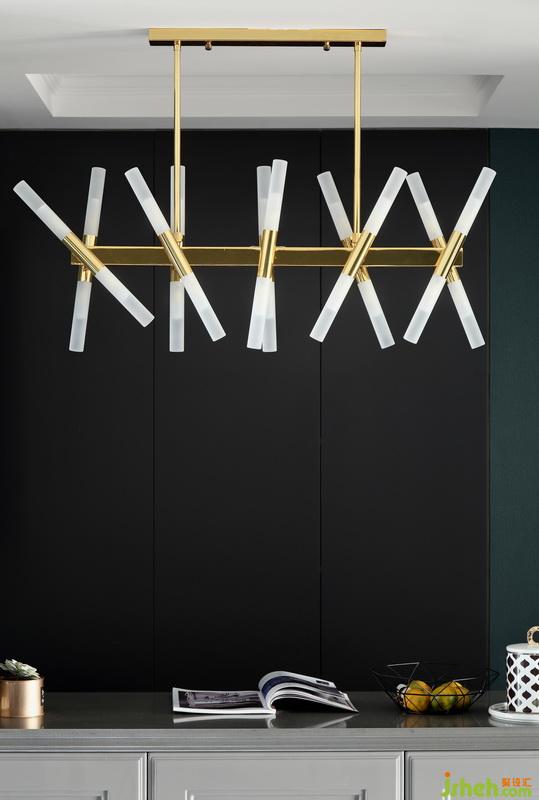 吧臺上金色的吊燈,散發(fā)出精致感,給空間帶來亮眼的點綴,提升了屋內(nèi)的氣質(zhì)。后面沿著墻做了一面黑色柜子,讓整個空間更加的凸顯復(fù)古韻味,也增加了家里的收納空間。
