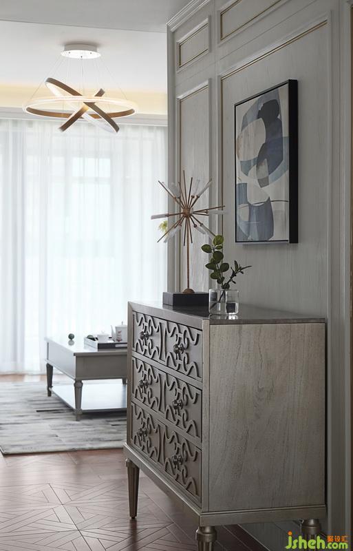 進門即是玄關,玄關柜將鞋柜功能及裝飾融合在一起,柜上精美的圖紋猶如象形文字“羊”,有吉利、祥瑞的寓意,可以展示出屋主的品位。藍調(diào)的抽象畫掛在淺灰的護墻上,帶來一份簡潔、優(yōu)雅的美。桌上的石英石擺件簡單、輕巧,使空間更顯質(zhì)感與靈動。搭配幾支花花草草,擺放在此處,讓人倍感生活儀式感。