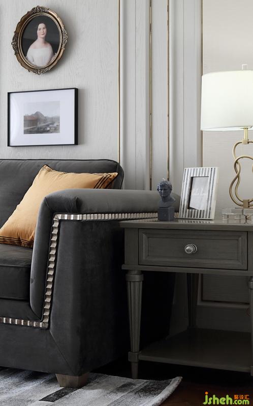 客廳背景墻上的一組裝飾畫是現(xiàn)代與復古結合的碰撞,突顯出室內(nèi)濃厚的韻味。沙發(fā)不經(jīng)多余的修飾,深灰色的搭配穩(wěn)重、考究,中間嵌入的扇貝型木條簡約時尚如海面的波紋,提升空間獨特的格調(diào)和品位。
