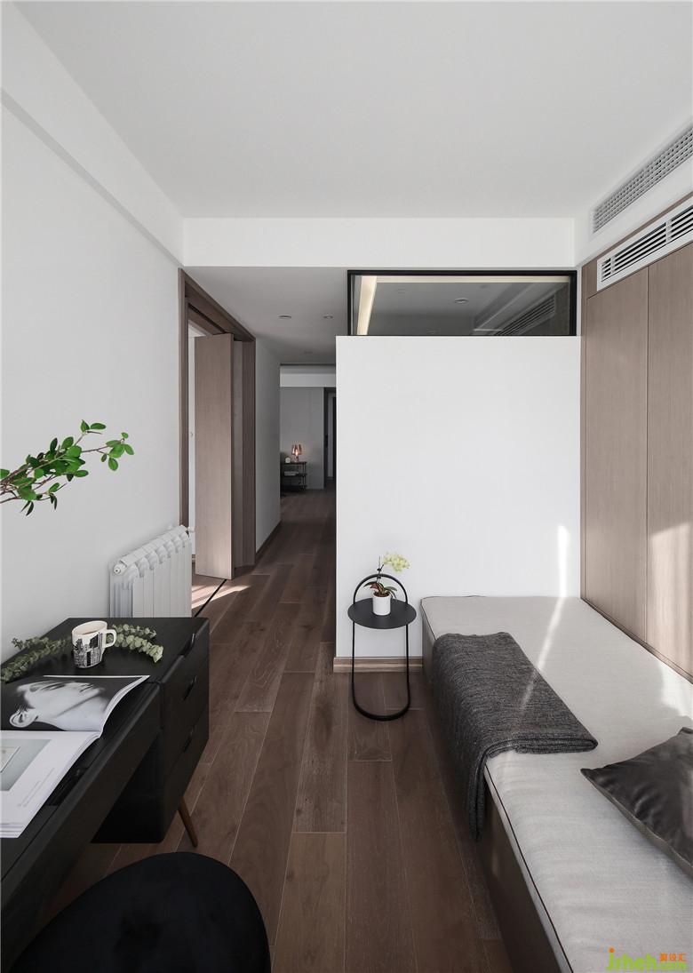 從書房沿著過道可以看到客廳,此處沒有設(shè)置門,這樣可以擺脫門的限制,增加屋內(nèi)的通透性。書房與衛(wèi)生間隔墻做了40公分高的玻璃隔斷,很好的將光線引入了衛(wèi)生間內(nèi),使得屋內(nèi)的每一個房間都明亮通透。