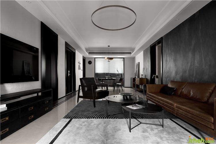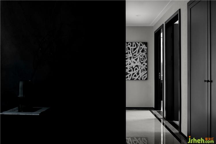 過道一側(cè)定制了黑色的儲(chǔ)物柜,與整屋色調(diào)相統(tǒng)一,寬1.4米,深度60公分,可以滿足屋內(nèi)的收納需求。盡頭處掛了一幅黑白兩色的裝飾畫,色塊的堆積和交錯(cuò),透露出別樣的趣味和情調(diào),為空間注入活力。