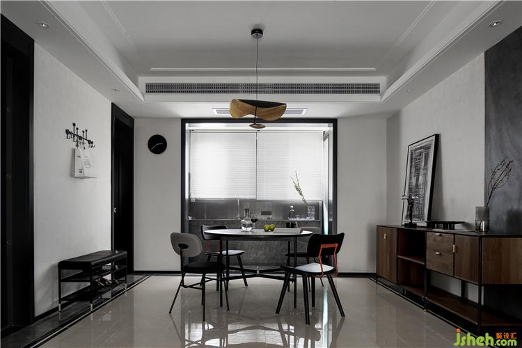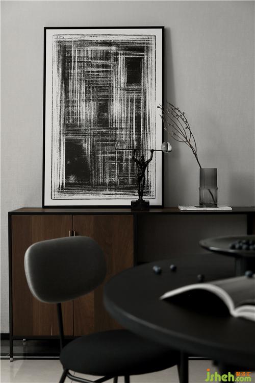 開放式與封閉式相結(jié)合的餐邊柜,集展示與收納為一身,原木色的柜子也為空間增添了暖意。一幅黑白的抽象裝飾畫,與整體風(fēng)格相匹配,營造出空間的藝術(shù)氣息。