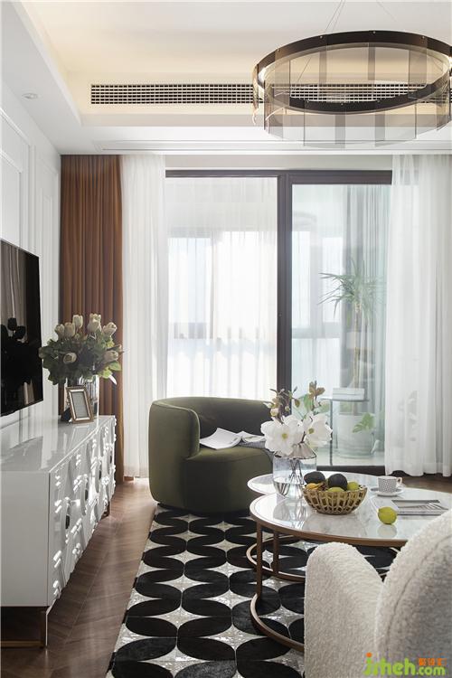窗簾搭配了姜黃色與白紗的組合,在光線的暈染下顯得明亮俏皮,帶有一絲輕熟的氣質(zhì),充滿時(shí)髦韻味。墨綠色的休閑沙發(fā)擁有圓潤的造型與舒適的坐感,盡顯高貴大方,同時(shí)彰顯其含蓄與內(nèi)斂。