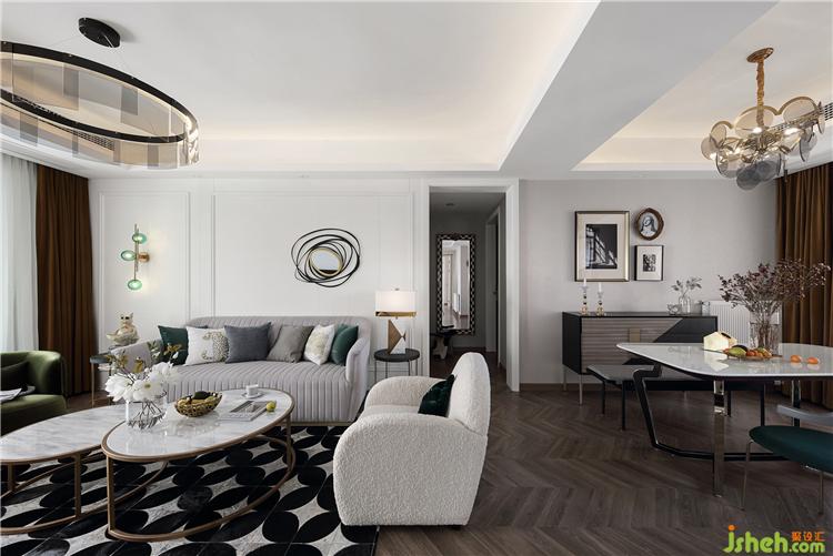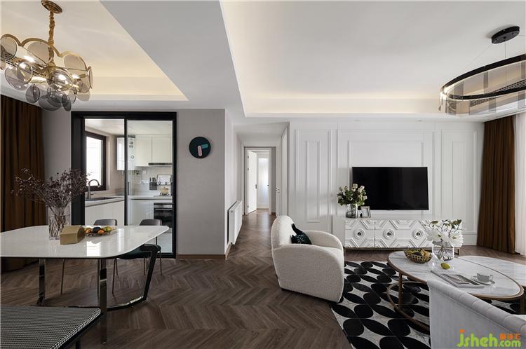 客廳與餐廳之間通過吊頂將兩者劃分開。整屋地面更換了咖色的魚骨拼地板,莊重而不失雅致,為空間帶來了層次感。