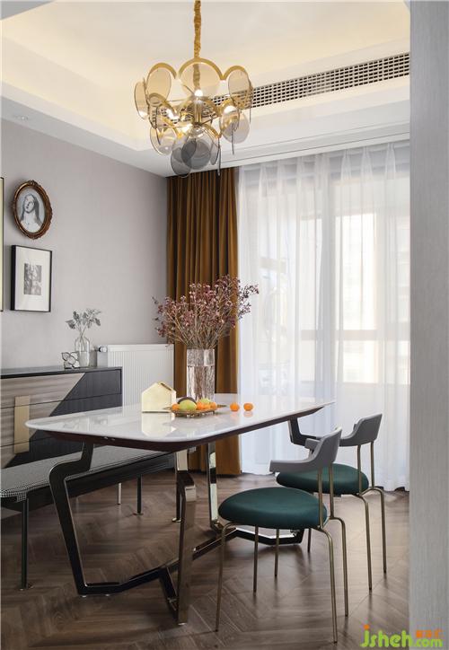 餐廳的吊燈由金色五金與煙灰色玻璃片組成,既時(shí)尚又高雅。餐桌椅搭配了餐桌、條凳和兩把椅子的組合,就餐時(shí)可以變換不同的座位,夫妻倆都在家時(shí)可以一起坐條凳,更能增加彼此的親密感。白色大理石餐桌造型優(yōu)雅,增添了生活的品質(zhì)感;餐椅由灰色、墨綠色與黃銅色搭配而成,將美學(xué)與舒適感融入其中,營造出輕松美妙的就餐氛圍。