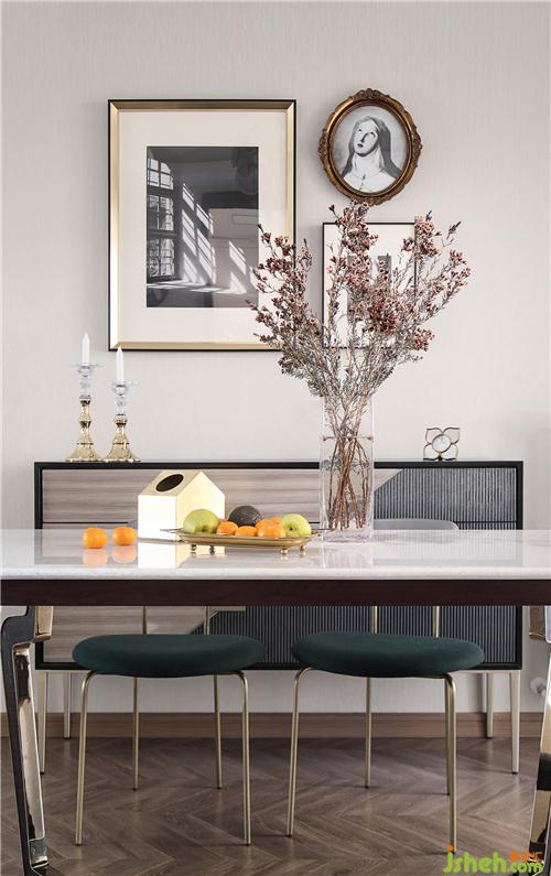 餐邊柜既美觀又實(shí)用,為餐廳增加了收納空間,在上面擺放兩根燭臺(tái)和小的裝飾物,可以裝飾出更美的家居空間。墻上的裝飾畫為空間增添了一份復(fù)古韻味。