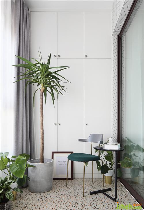 這是南陽臺(tái),主要作為休閑空間,地面鋪設(shè)了彩色的水磨石,在光線照射的反射下,顯得溫暖而柔和,為空間增添了跳躍感。我們在一側(cè)定制了白色的柜子,與整屋色調(diào)一致,增加了收納空間。在此處種上一些綠植,閑暇時(shí)泡上一杯熱咖啡,聞著杯中散發(fā)的縷縷清香,看著窗外的景致,也是生活的一種享受。