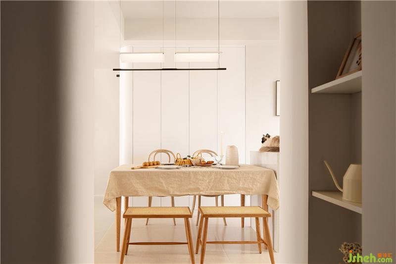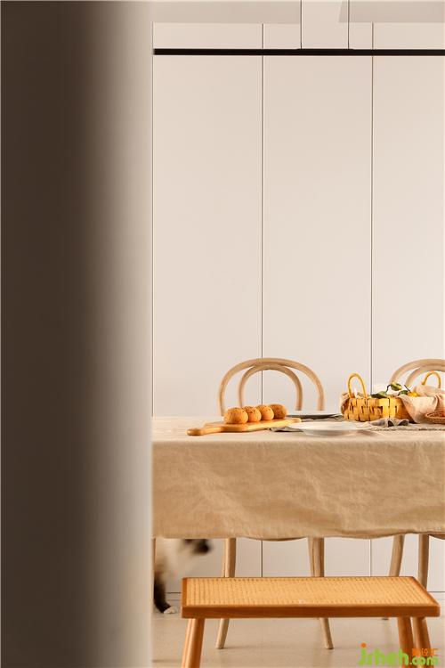 通過玄關(guān)就來到了餐廳,餐廳采用餐桌+兩把靠椅+兩把條凳的組合方式,使空間看起來不死板,沒有靠背的條凳也會更節(jié)省空間。餐桌椅選擇了原木材質(zhì),搭配上藤編的工藝,南京室內(nèi)設(shè)計(jì)師自帶一種質(zhì)樸隨和的氣質(zhì),在光線的暈染下,整體散發(fā)出復(fù)古韻味。餐桌鋪上一塊奶咖色的餐布,營造出溫暖、有活力的氛圍,更能增加食欲。餐椅后面的墻體拆除后,定制了一排暖白色的儲物柜,轉(zhuǎn)角處同樣采用了圓弧處理,增加收納的同時又使空間顯得更輕盈明潤。