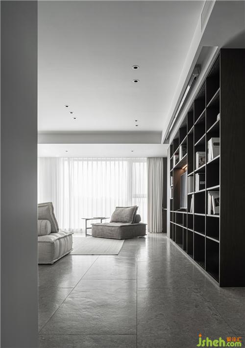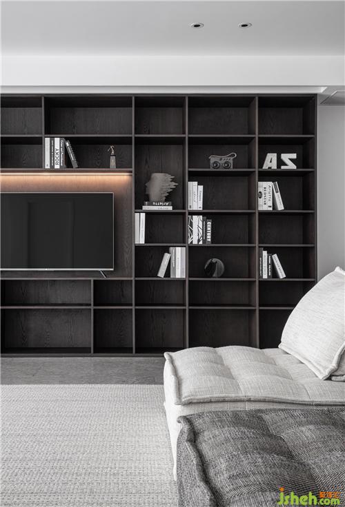 整面的開放式書柜,滿足了屋主愛看書的習(xí)慣。將電視內(nèi)嵌于其中,滿足多種功能需求。