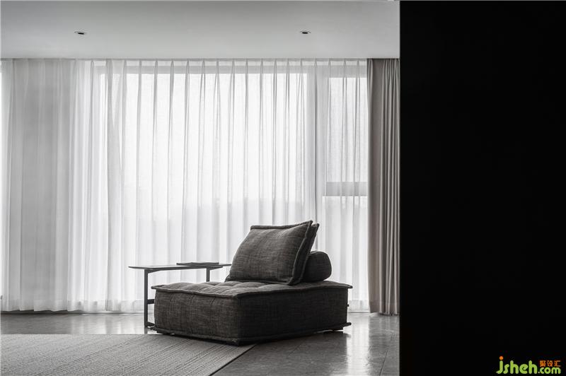 客廳的沙發(fā)由三塊可移動的單人沙發(fā)所組成,可隨心意擺放在任一角落,半躺的設(shè)計有助于壓力的釋放,在這寬廣的客廳空間中最適合不過了,灰色與米色的搭配也更顯高級感。地上鋪上一塊淺色的棉麻地毯,帶來一份溫潤與清新。