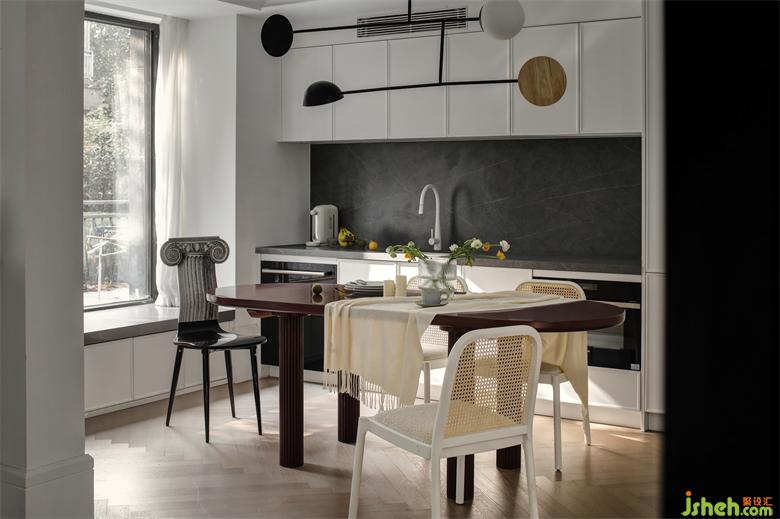 餐廳的主色調(diào)與客廳保持統(tǒng)一,使得整體家居更加協(xié)調(diào)。南京裝修設(shè)計(jì)在餐廳空間中加入西廚區(qū),為就餐和簡(jiǎn)單的烹飪提供了便捷,靠窗位置設(shè)有一處飄窗,使得光線可以充分的引入室內(nèi),在這可以一家人充分享受就餐的樂趣,說說笑笑,拉近彼此的距離。冰箱、烤箱和洗碗機(jī)內(nèi)嵌于柜內(nèi),使空間保持整體性,凸顯了詩意般的時(shí)髦感。
