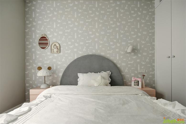 兒童房選購了一款灰色的日出兒童床,如日出半圓形狀的床頭設(shè)計(jì),南京裝修設(shè)計(jì)造型簡潔,趣萌可愛。背景墻采用灰色基調(diào)的墻布,配置上卡通圖案,簡約中透射出溫馨活潑的氛圍。