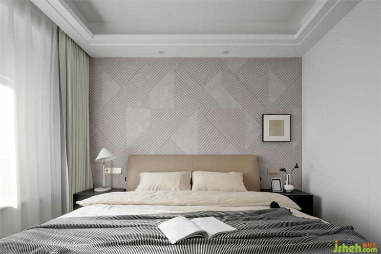 燕麥色的真皮床,純粹簡約,帶來一種素雅柔和的感覺,飽滿柔軟的靠感,南京家居設計讓倚靠更加舒心。床頭背景墻鋪貼了淺灰色的幾何狀墻布,無限延伸的線條,縱橫交錯,形成立體的視覺效果,理性的圖形及色塊營造出高級的質感與氛圍。一幅裝飾畫點綴其中,帶來一份美好與品位。