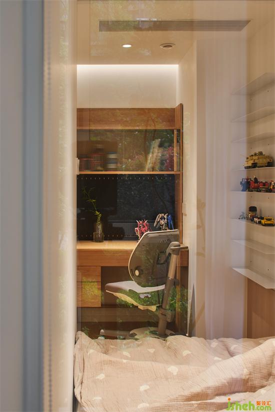 兒童房由原臥室隔出的一個(gè)空間打造,與陽臺(tái)之間通過透明玻璃隔斷引入采光,南京銀城聚錦園家裝設(shè)計(jì)解決了暗間的問題;暖白色和自然木質(zhì)在柔和的光線下變得溫暖。