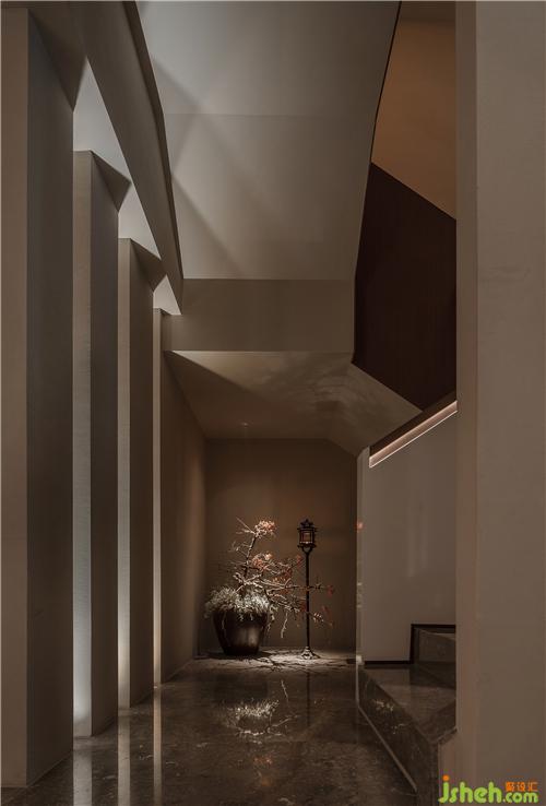 素色結(jié)構(gòu)立柱頂天立地,光線經(jīng)縫隙穿流而過(guò),在天花與墻面形成光影,它們可以是文人書(shū)房格柵的想象,也可以是縱橫山岳起伏的解構(gòu),空間不動(dòng)聲色,但已交出一切。