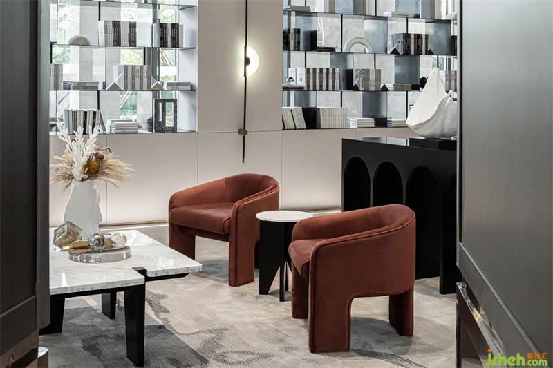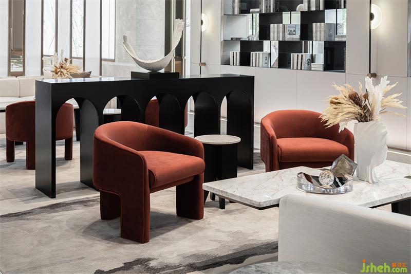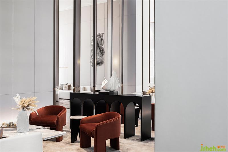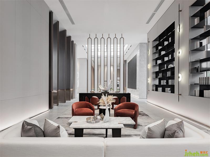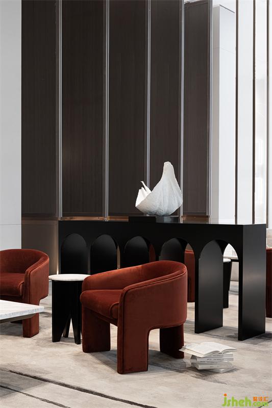 在開(kāi)敞的空間形成段落兜轉(zhuǎn),通過(guò)兩側(cè)不同的光影、明暗的過(guò)濾,傾瀉于此的自然光更顯時(shí)光的分量。光影錯(cuò)落有致,沙發(fā)組凸顯質(zhì)感品質(zhì),點(diǎn)綴紅色洽談椅用來(lái)平衡空間的重量,它或深沉或內(nèi)斂,衍生功能的秩序,空間在低吟淺誦中建立微妙的靜態(tài)平衡。