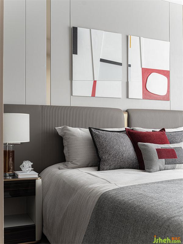 臥室的陳設(shè)被黑白灰加持,紅色的點(diǎn)綴中和了空間配色的單調(diào),形式多樣的裝飾畫與背景裝飾燈讓室內(nèi)氣質(zhì)透著時髦與靈動。