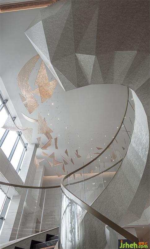 在大量使用斜線切割元素的空間內(nèi)部,通過(guò)穩(wěn)健的立方體塊和燈光配合,讓建筑模型沙盤(pán)“懸浮”于此區(qū)域中央,通過(guò)規(guī)則的小體塊與斜向的大體塊之間的對(duì)比,產(chǎn)生一種強(qiáng)烈的視覺(jué)沖擊,星芒為形,光線為燈,斗轉(zhuǎn)星移,對(duì)話未知,給人對(duì)宇宙空間無(wú)限的遐想,旋轉(zhuǎn)律動(dòng)的創(chuàng)意,讓空間擁有了時(shí)空之光的靈感,讓人們感受到夢(mèng)境中所閃耀的藝術(shù)光芒。