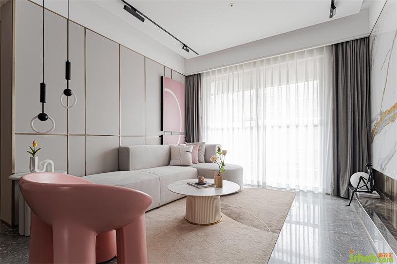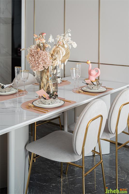 粉色給人的既定印象是少女心,空間以粉色為主,形塑現(xiàn)代文藝感。客餐廳用粉色暖色系為配色,為空間注入一絲甜甜的亮點,餐廳精致的粉色餐具與擺件搭配,和客廳的粉色扶手椅相呼應,空間略顯清新優(yōu)雅。