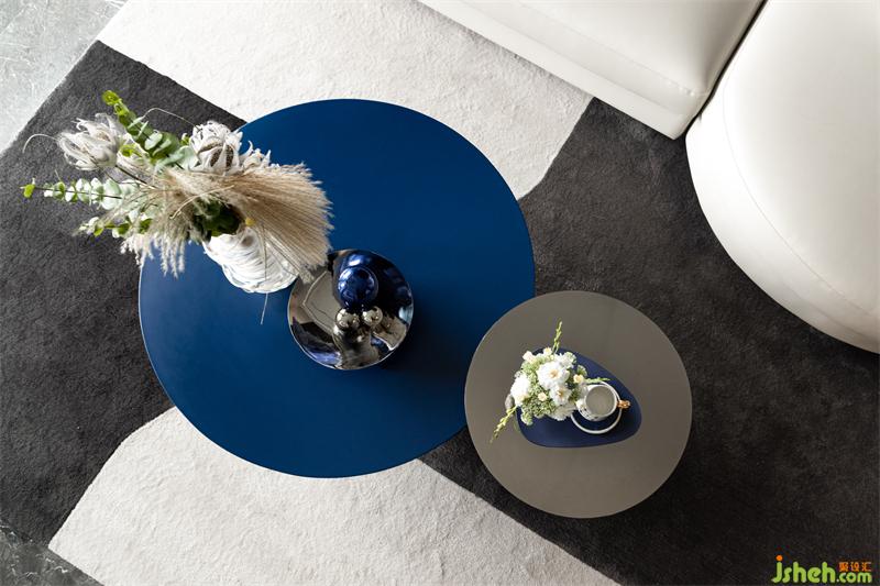 寧靜之藍,生活之味,個性的藍將客餐廳一體貫通,空間瞬間流動起來,映襯著藍色的個性茶幾,黑色簡潔的沙發(fā)背景墻也與幾何裝飾的墻飾冷暖互補,強調(diào)了空間的秩序感和節(jié)奏感。