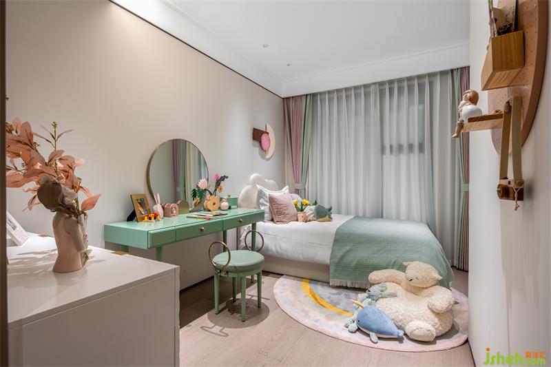女兒房的整體色調(diào)以低飽和度的搭配呈現(xiàn),保持精致感的同時(shí)又不失活潑圓潤,一改傳統(tǒng)設(shè)計(jì)中過量的粉飾,清淡純真的色調(diào),像少女綻放的內(nèi)心世界,讓人留戀著迷。
