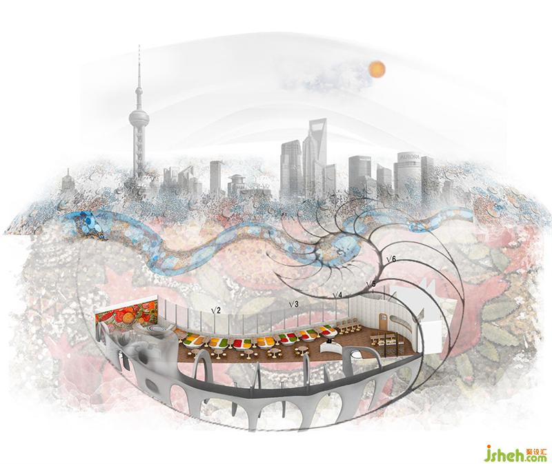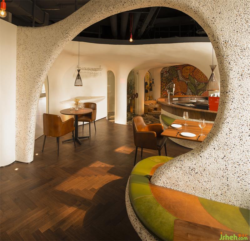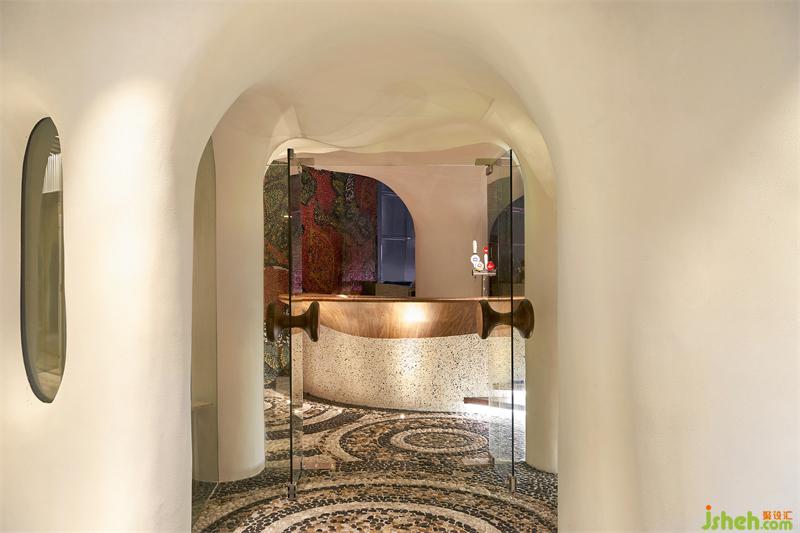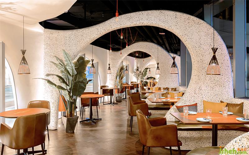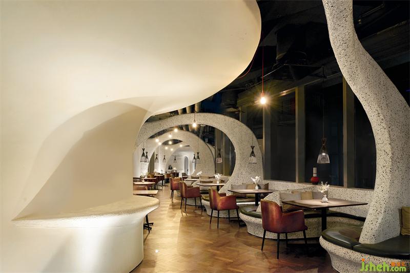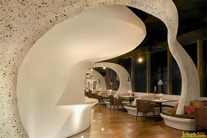 上海Tapa Tapa西班牙餐廳,位于北外灘白玉蘭廣場,其經(jīng)營理念是打造一個融合了巴塞羅那熱情和上海小資情調(diào)的餐飲空間,開創(chuàng)一個既有西方地中海浪漫風(fēng)情又兼具東方優(yōu)雅含蓄的生活場域。上海餐廳設(shè)計為了兼具融合這兩種地域文化的特點,CROX闊合以 "海的回聲" 為設(shè)計概念,將自然的渦漩體作為整個空間的基礎(chǔ),海螺的紋路一圈圈巧妙的安排在細(xì)長形的場地內(nèi),像是一處既開朗又神秘的洞穴。天然的韻律在此自由、豐富、隨心所欲的流淌,為賓客帶來非常愉悅的視覺觀感和用餐體驗。