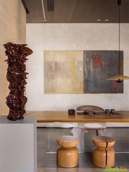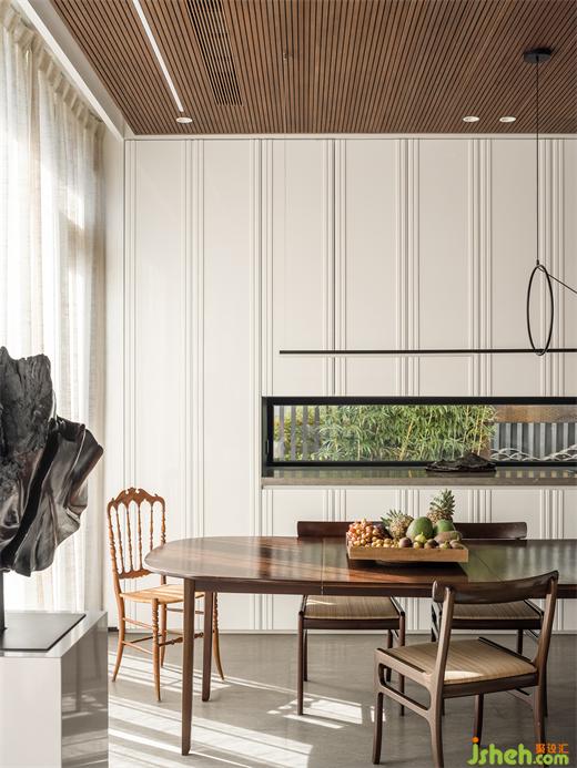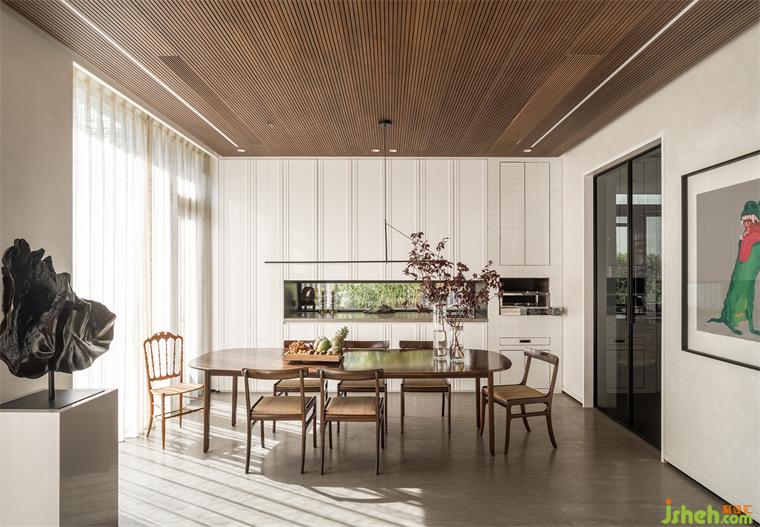 一樓的客餐廳并未明確設限區(qū)域,而是以體塊的形式在各個區(qū)域呈現(xiàn)相對獨立的中心,別墅改造設計一整面的落地窗,借景戶外,引陽光入室內(nèi),近一步放大了戶內(nèi)空間與自然環(huán)境的關系,公共空間在格局上盡量開闊,滿足空間之間的聯(lián)動性。
