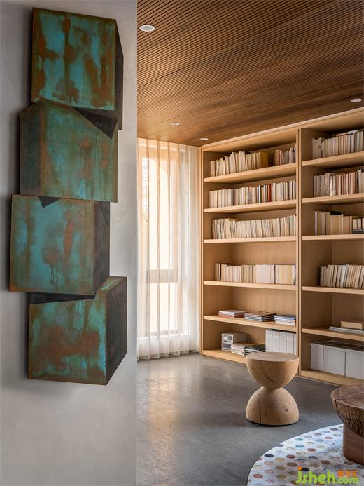 別墅改造設計考慮到孩子在成長過程中最重要的是陪伴和互動,也希望能夠讓孩子將學習與生活分開,樓梯上來,便是一個開放式書房,使二樓的空間利用率達到最大化。延續(xù)一樓的設計元素,原木色的書柜可以容納業(yè)主大量的書籍。