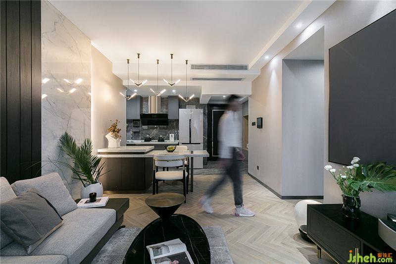 墻面背景的材質(zhì)設(shè)計(jì)雖然沒(méi)有明顯的區(qū)域劃分,但是可以自然的讓人產(chǎn)生功能分區(qū)。