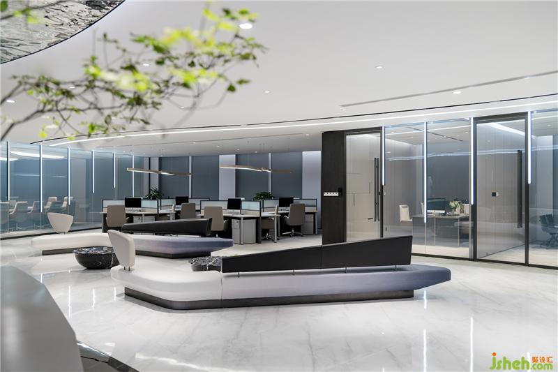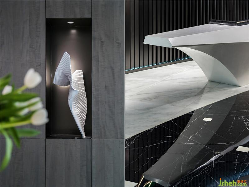 藝術(shù)是空間的底色,藝術(shù)作品應當具有人文關(guān)懷和文化啟蒙。設(shè)計師根據(jù)行業(yè)屬性及企業(yè)文化創(chuàng)作的雕塑作品“源”,通過一層層的亞克力、形似煤炭的石子,疊加構(gòu)成樹的姿態(tài),形成虛實的變化,也成為吸引人駐留的一隅清凈處。