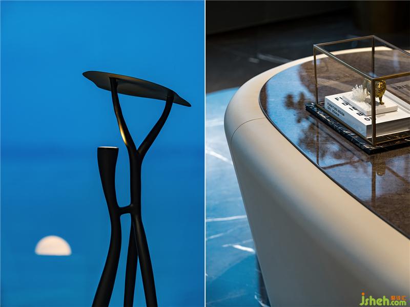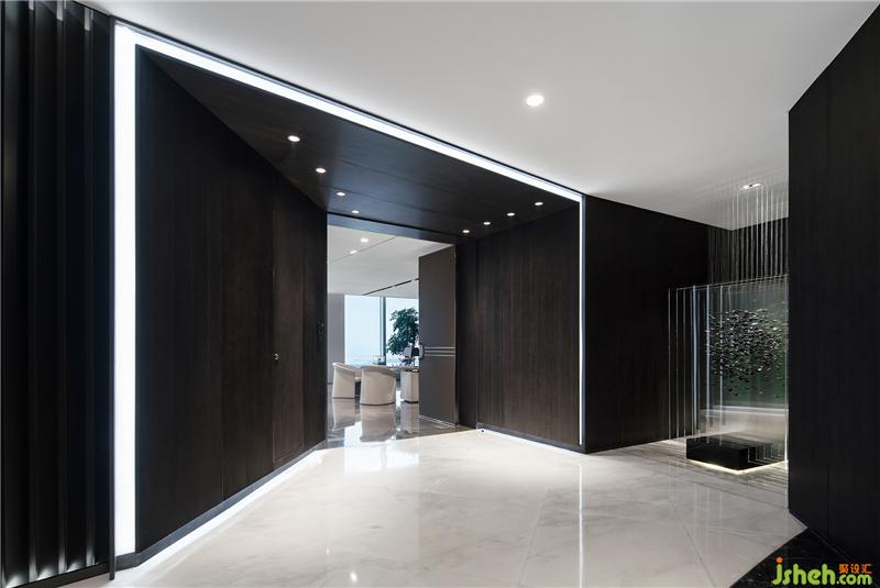 公共區(qū)域由獨立的門廳過渡到vip商務室。通過面部識別后,兩扇門緩緩開啟--儀式感和科技感正是通過這樣的場景傳達給來訪者。整排的落地窗外,映入眼簾的是一覽無余的絕佳海景,帶來在云之巔的尊貴體驗。