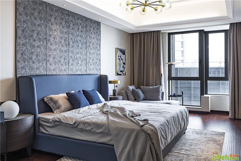 次臥延續(xù)客廳的藍(lán)色,墻面增加肌理灰的背景,豐富空間層次。