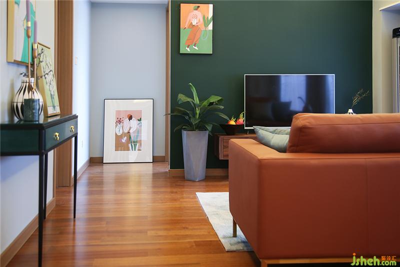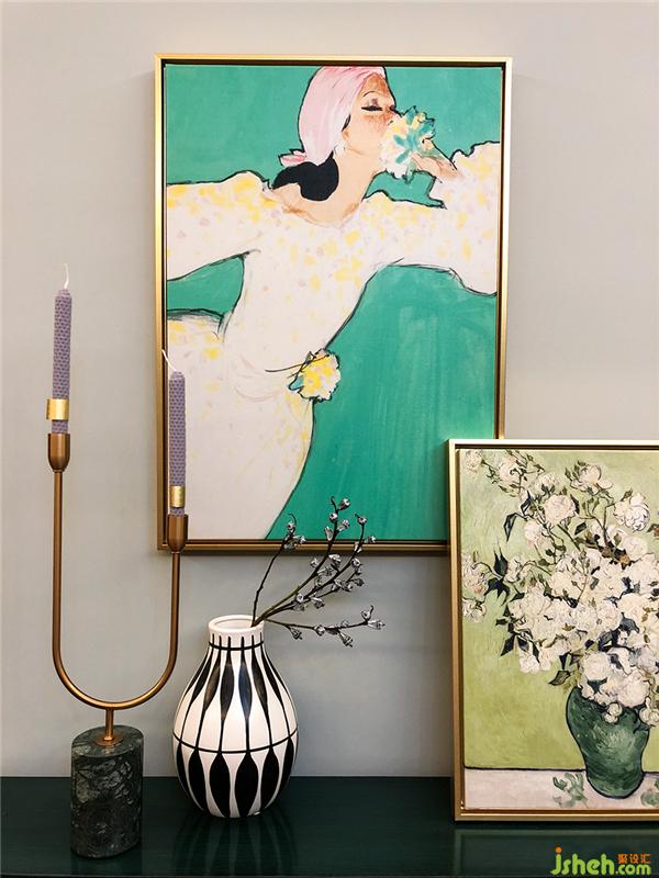 ▲我們確定了主色調(diào)之后,通過兩種方式來體現(xiàn)主色調(diào):大面積和高頻次,通過電視背景墻的色彩大面積定調(diào),再通過小物體的不斷重復,比如同色調(diào)的掛畫、綠色大理石的花器、餐墊、抱枕、柜子的門板等不管是什么綠色都屬于一個色調(diào)。