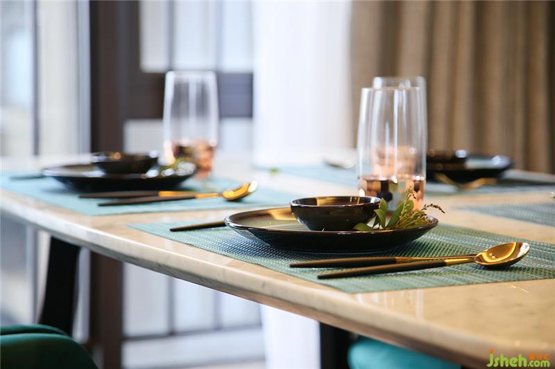 ▲餐廳的墨綠色絨布餐椅和墻面遙相呼應,空間色彩的連續(xù)性得到了延伸。餐椅扶手的弧度與卡拉拉白大理石餐桌的圓弧切線柔軟得剛剛好。