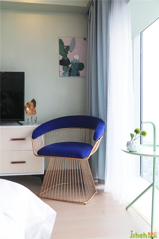 造型簡(jiǎn)約的深藍(lán)色坐椅卓爾不群,優(yōu)雅的放在在落地窗旁,坐在上面望向遠(yuǎn)方,不禁沉迷于這江天一色。